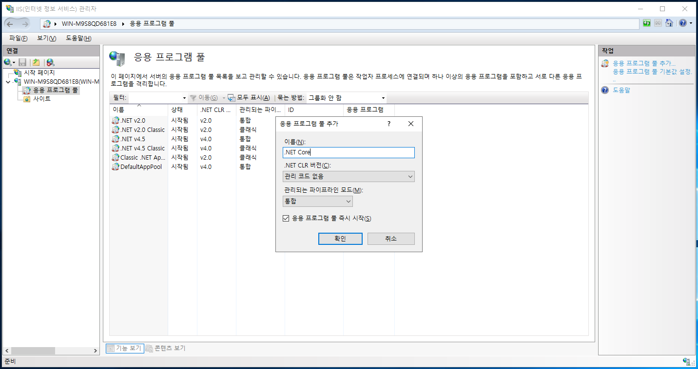IIS에서 다음과 같은 설정으로 응용프로그램풀을 추가합니다.