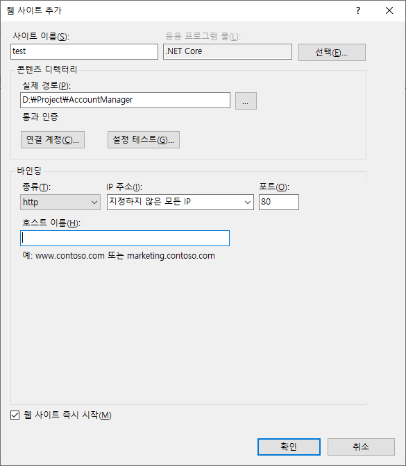 IIS에서 웹사이트를 추가합니다. 프로젝트가 배포된 폴더를 지정하고, 특히 응용 프로그램 풀은 조금전 생성한 풀로 지정해야 합니다.