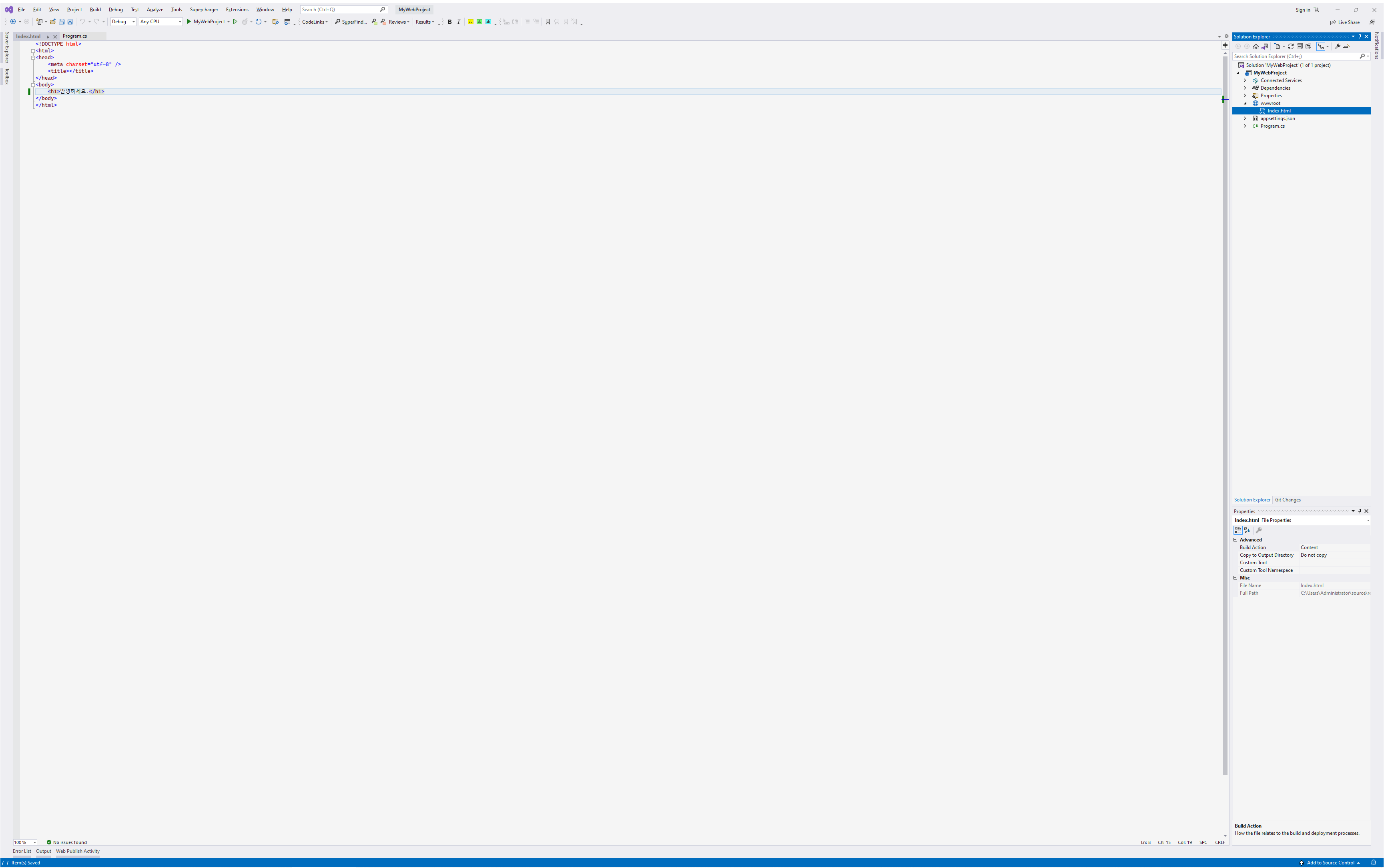 설정내용중 profiles부분이 개발을 위한 호스팅 환경설정입니다. applicationUrl은 프로젝트가 실행될때 연결되는 URL을 의미하므로 이곳에서 포트를 변경할 수 있고 launchBrowser는 Visual Studio가 자동적으로 browser를 실행할지의 여부를 나타냅니다. 특히 environmentVariables의 ASPNETCORE_ENVIRONMENT가 Development로 되어 있는것에 주목해 주세요. 이 값을 Production으로 바꾸면 IsDevelopment()는 false를 반환하게 됩니다.