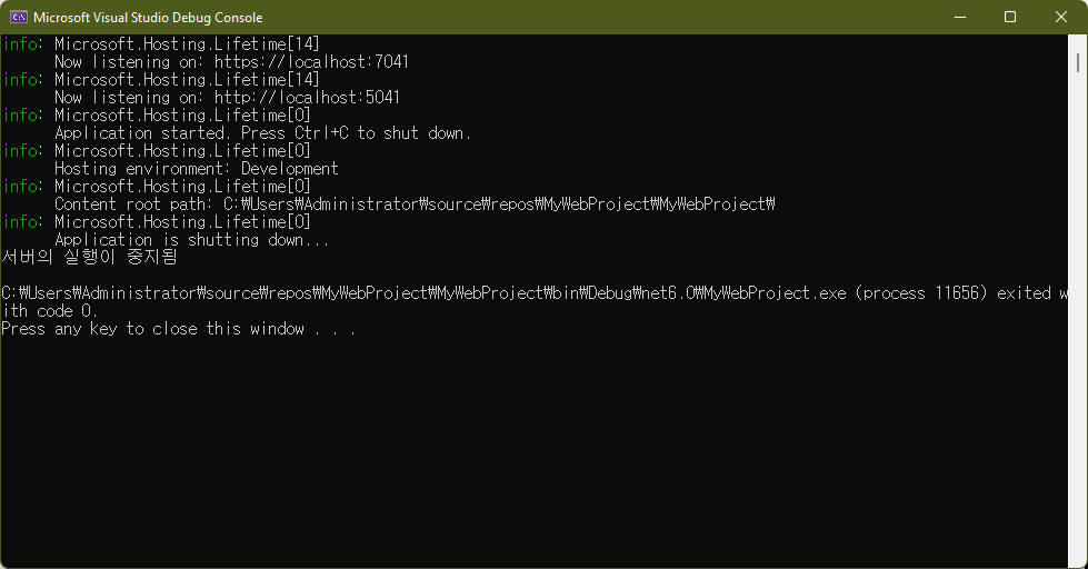 서버의 실행을 중지하기 위해 Ctrl + C키를 사용합니다. 그러면 웹서버가 중지되면서 조금전 추가했던 Writeline() 메서드의 메세지를 볼 수 있게 됩니다.