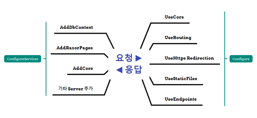 | UseEndpoints() | 파이프라인이전에 응답을 생성하기 위해 실행할 미들웨어를 추가하며 2개의 endpoint가 추가됩니다. - MapRazorPages : 요청 URL로 /Pages폴더에 있는 Razor Page 파일명을 찾을 수 있도록 하며 이에 대한 응답을 생성하는 미들웨어를 추가합니다. - MapGet : 요청 URL로 inline delegate를 찾을 수 있도록 하며 HTTP응답을 직접적으로 만들어 내는 미들웨어를 추가합니다. |