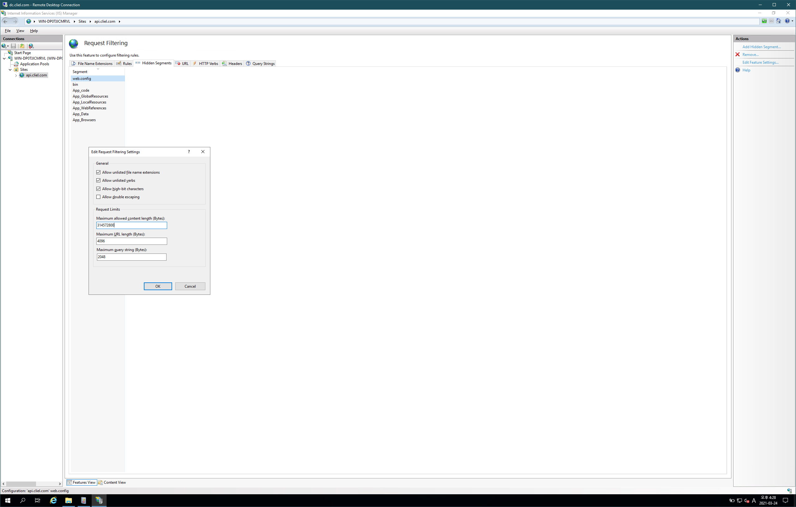 서버에서도 대용량파일의 요청을 받아들일 수 있도록 설정해야 합니다. 만약 IIS라면 다음과 같이 web.config에서 요청가능한 최대용량을 설정할 수 있습니다.