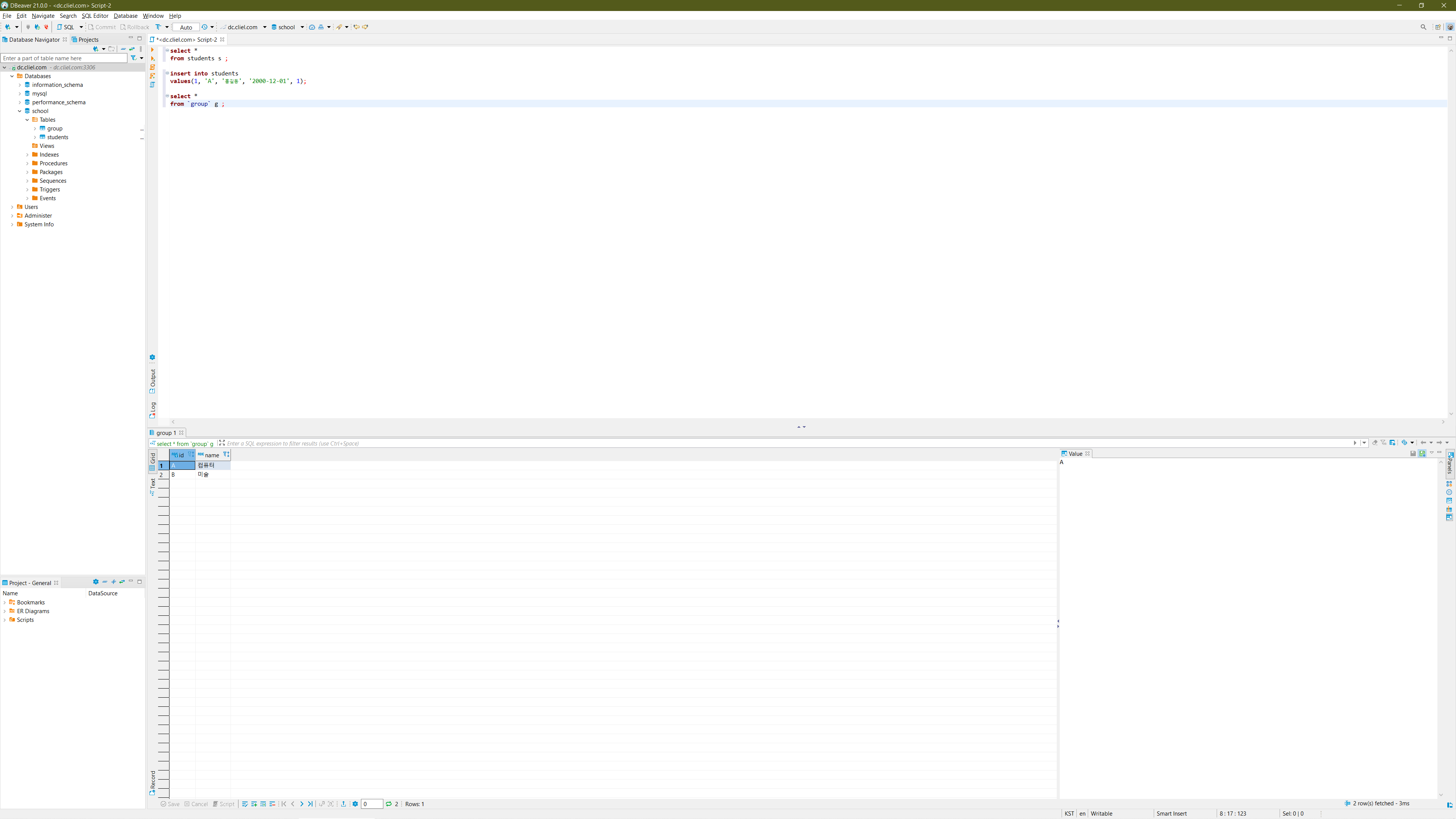 당연한 얘기지만 사용할 DB와 Table을 미리 만들어 둡니다. 예제에서는 school DB에 student와 group이라는 2개의 테이블을 생성하고 진행하도록 하겠습니다.
