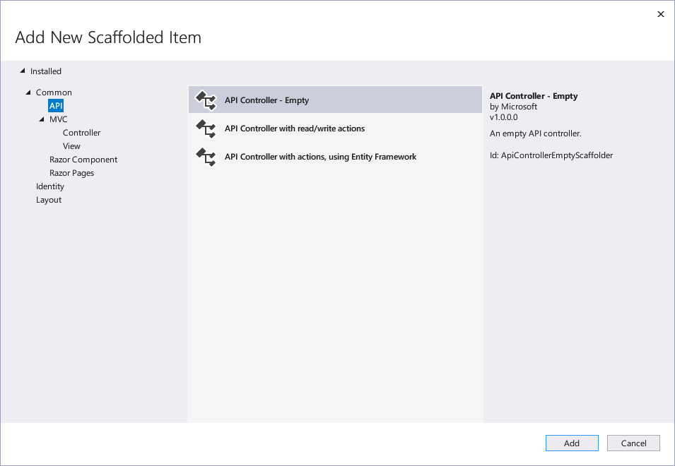 이후 Scaffolded 화면에서 왼쪽에 API를 선택하고 오른쪽에 'API Controller - Empty'항목을 선택한뒤 Add 버튼을 눌러줍니다.