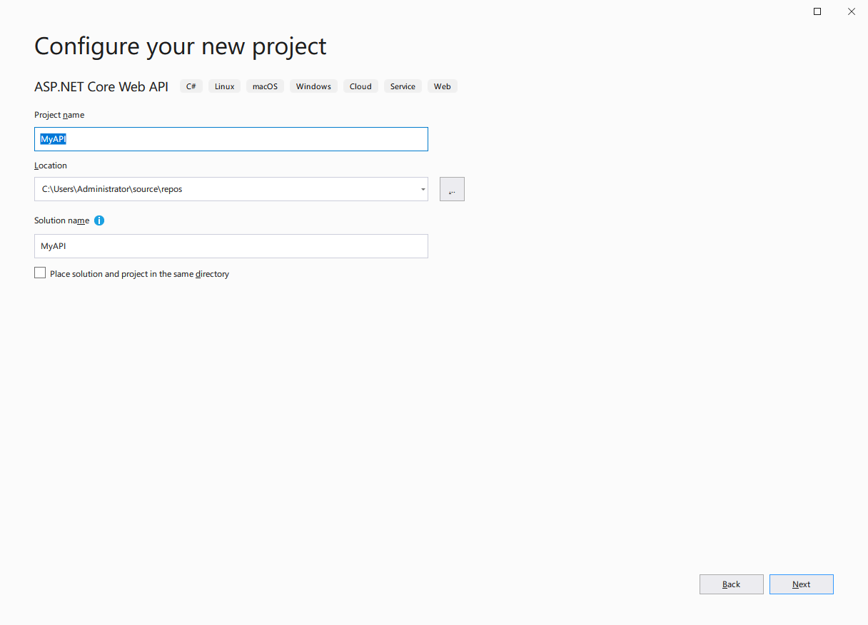 Visual Studio(2019)에서 프로젝트를 오른쪽 항목에서 'ASP.NET Core Web API (C#)'프로젝트로 선택하고 'Next'버튼을 눌러줍니다.