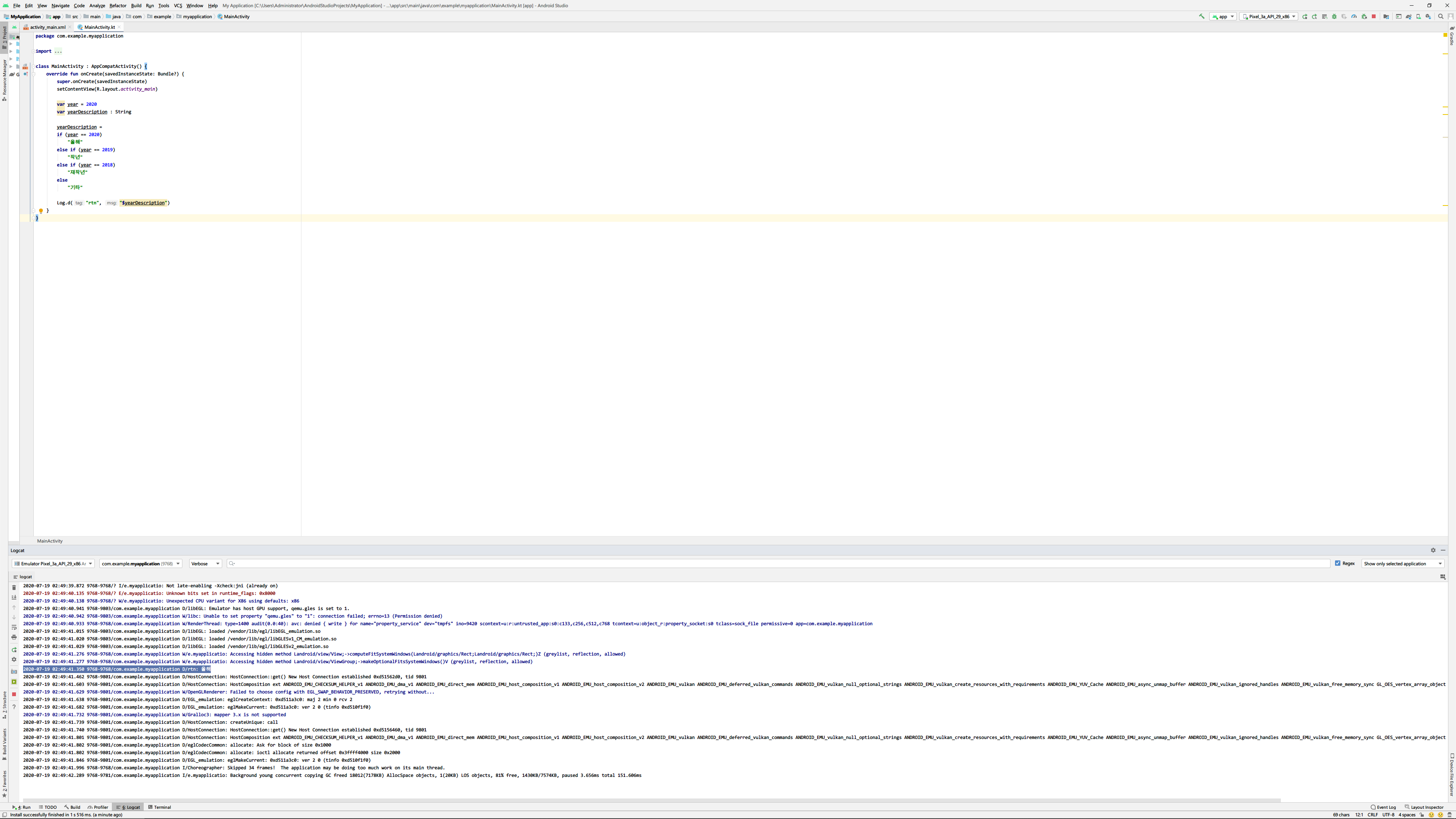 Log.d("실행", "$rtn")