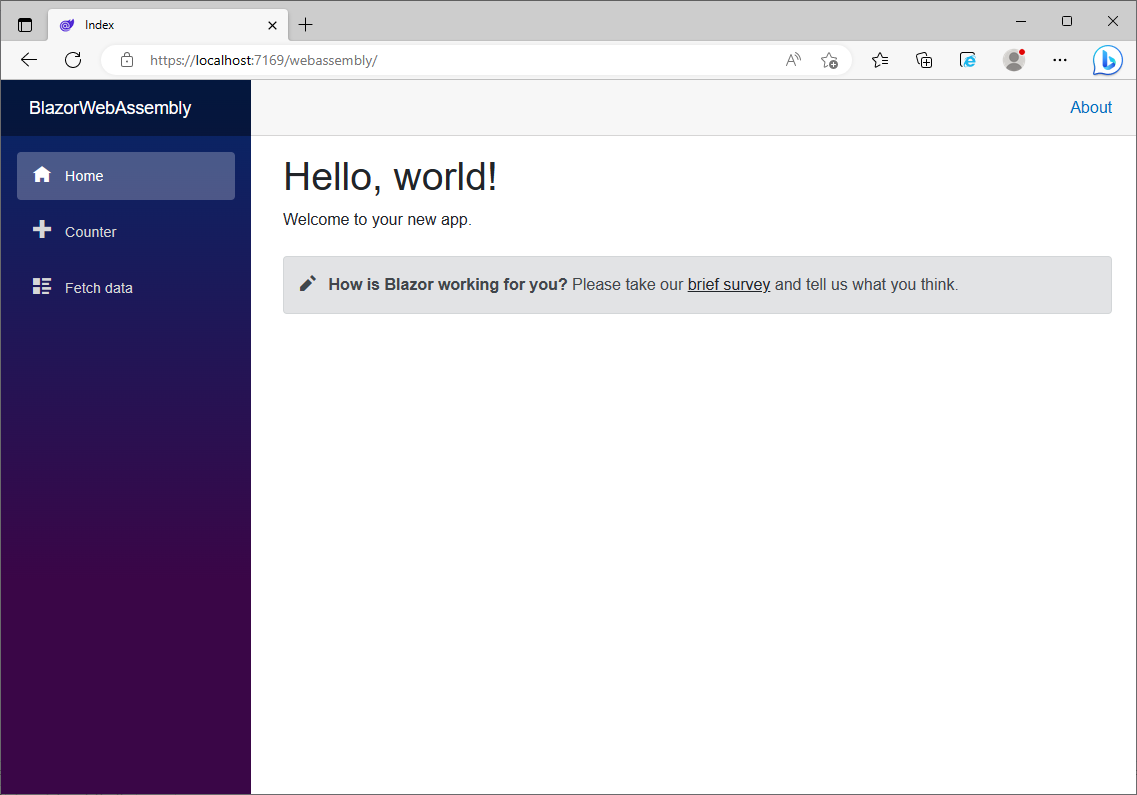 project를 실행하고 /webassembly로 URL을 요청하면 다음과 같이 BlazorWebAssembly project생성에 사용된 template의 placeholder content를 보게 될 것입니다.