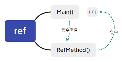 하지만 매개변수를 ref로 정의하는 경우에는 메서드를 직접 호출하는 호출자의 인수값을 참조하는 형태로 값을 전달합니다.