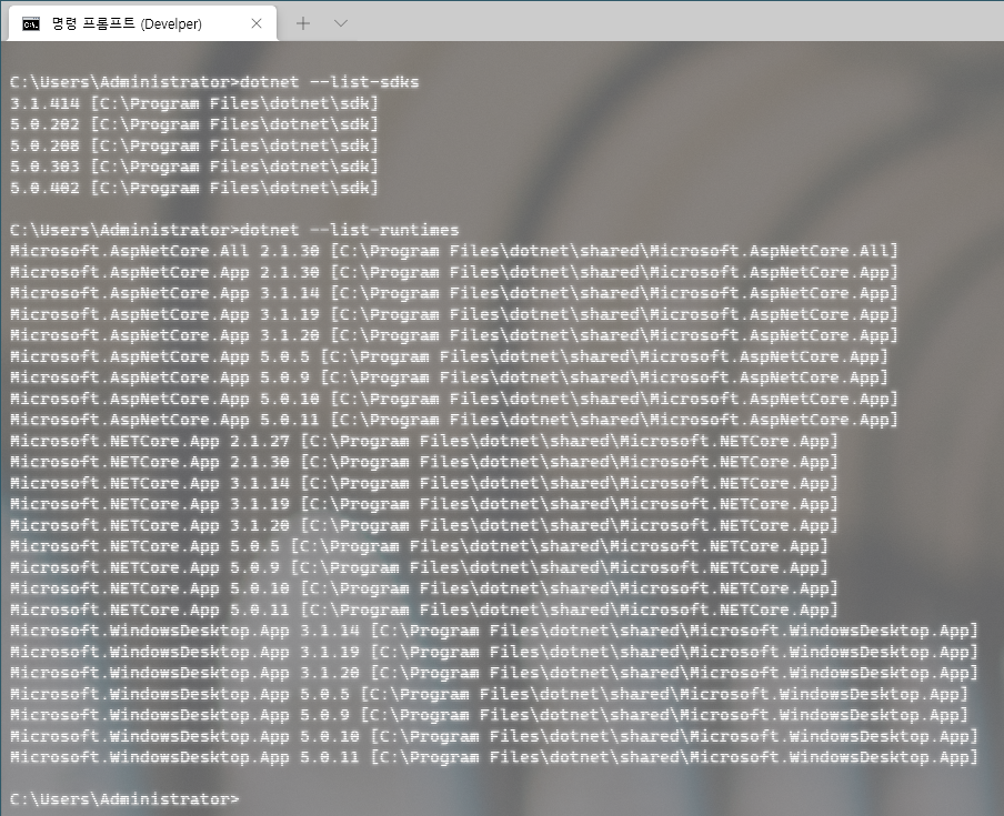 우선 아래 명령을 통해 SDK와 Runtime의 현재 System에 설치된 Version을 확인할 수 있습니다.