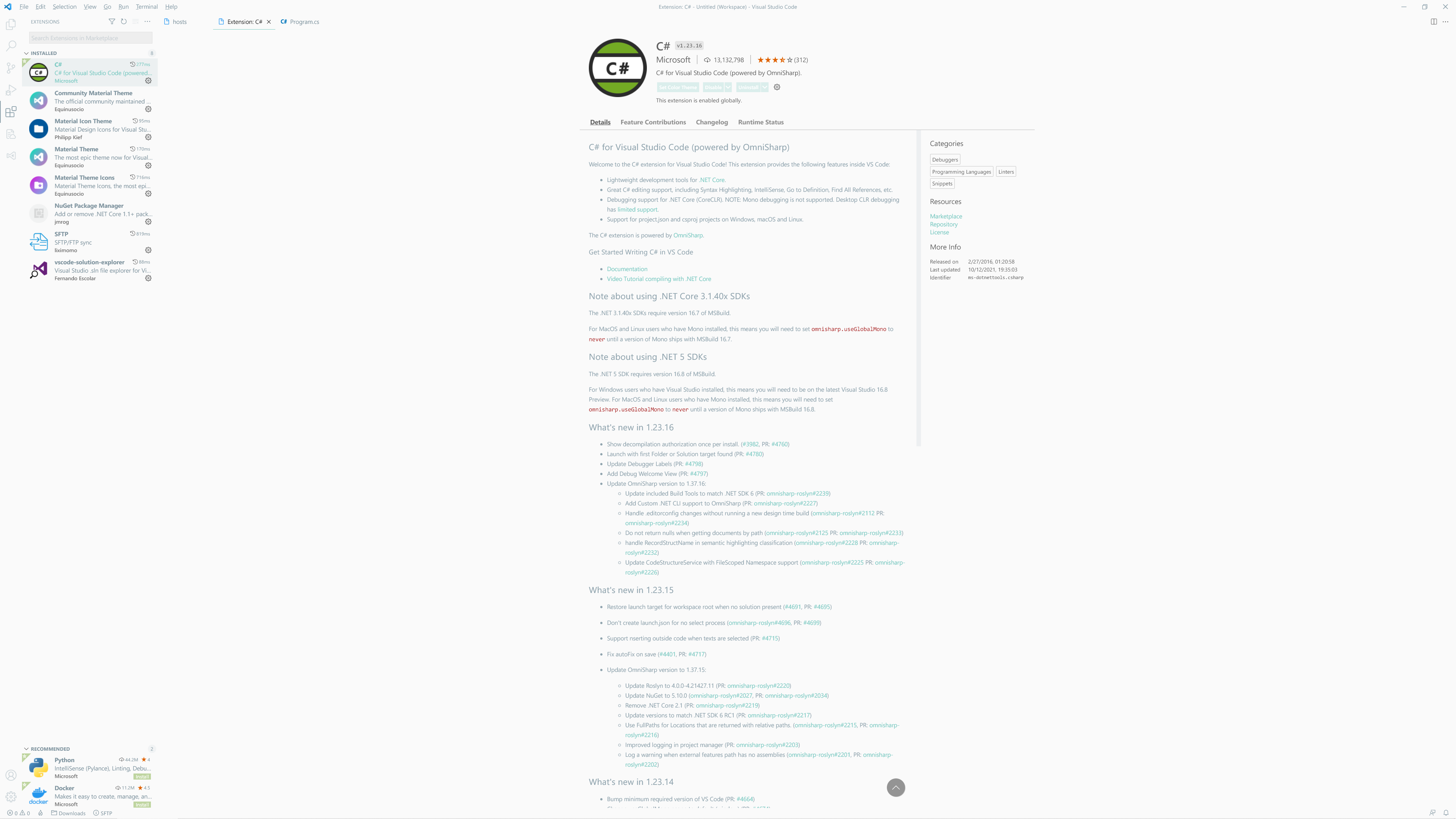 C# 확장 기능은 필수이며 기타 아래 확장 기능을 추가적으로 설치해 사용할 수 있습니다.