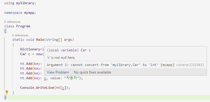 이전에 예제에서 System.Collections.Hashtable을 Dictionary<int, string>로 수정하게 되면