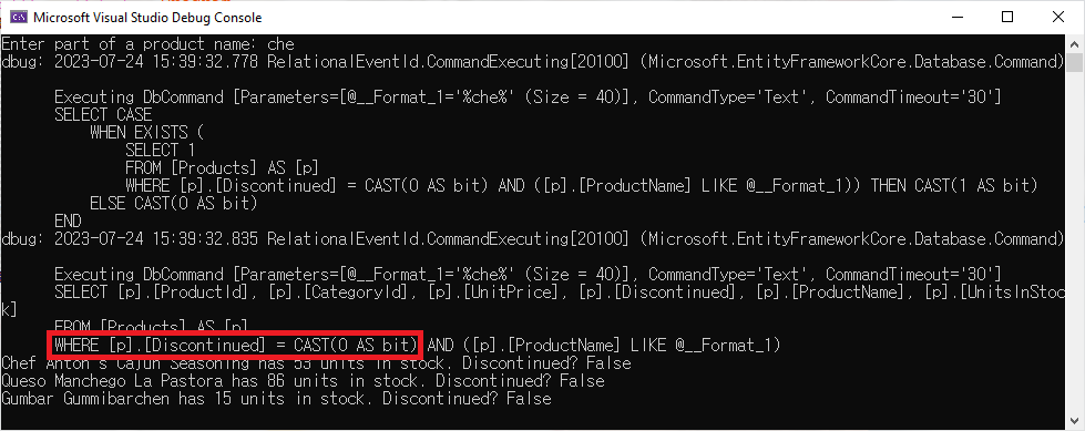 Program.cs에서 DeleteProductsBetter method를 호출하도록 하고 예제를 실행하면 다음과 같은 결과를 표시할 것입니다.