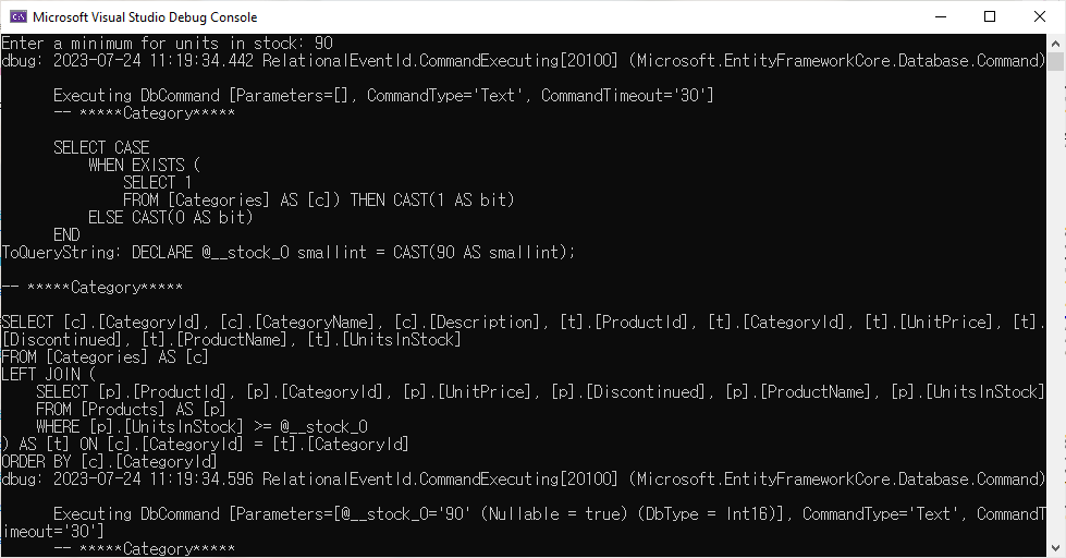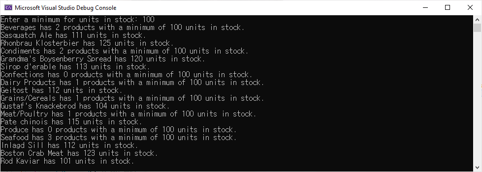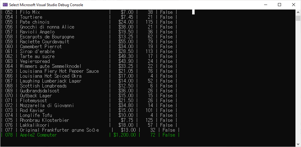 Program.cs에서 DeleteProductsBetter method를 호출하도록 하고 예제를 실행하면 다음과 같은 결과를 표시할 것입니다.
