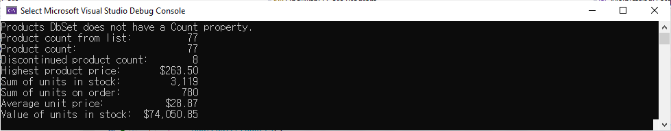 Console.WriteLine("{0,-25} {1,10:N0}", "Mean units in stock:", db.Products.Average(p => p.UnitsInStock));