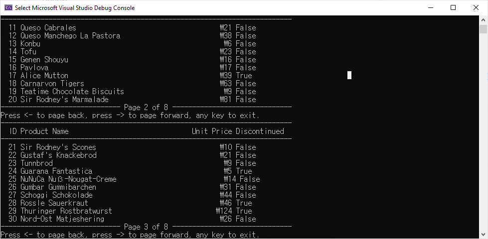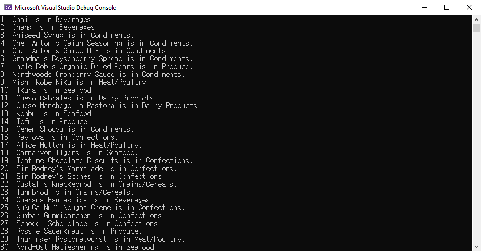 Program.cs에서 OutputProductsAsXml method를 호출하도록 한 뒤 예제를 실행하면 다음과 같은 결과를 표시할 것입니다.