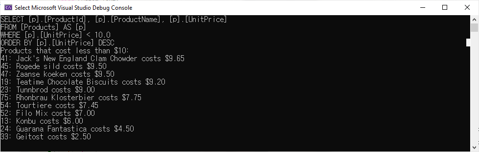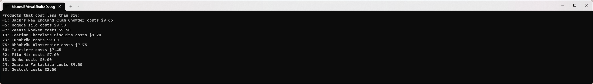 IQueryable<Product> filteredProducts = processedProducts.Where(product => product.UnitPrice < 10M);