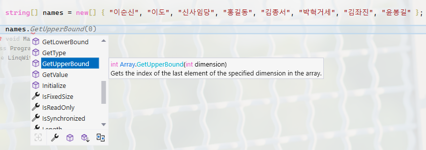 그리고 Program.cs에서 names에 Where 확장 method를 호출하도록 합니다. 이때 Where를 입력하기 위해 typing울 시도하면 아래와 같이 IntelliSense에 의해 array에서 사용가능한 member들이 표시되는데