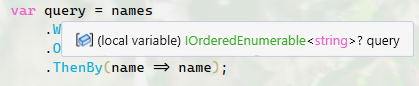 - LINQ query comprehension 구문(선택적) : 여기에는 from, in, where, orderby, descending, select와 같은 C# keyword가 존재합니다. 이들은 몇몇 LINQ 표현 method에 대한 별칭에 해당하며 특히 이미 SQL(Structured Query Language)과 같이 다른 query언어를 경험해 본 적이 있다면 이들을 더욱 친숙하게 사용할 수 있을 것입니다. 처음 LINQ를 사용할 때는 종종 LINQ query comprehension 구문을 LINQ라고 오해하는 경우도 있는데 이것은 선택적으로 사용하는 LINQ의 여러 부분 중 하나에 해당할 뿐입니다.