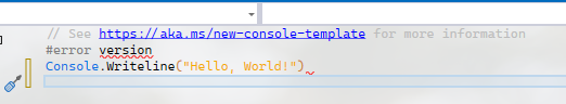 project가 생성되면 해당 project의 Program.cs file을 열고 첫 번째 줄 아래에 아래와 같이 C# version을 보여주는 구문을 추가합니다. 그리고 Debug / Start Without Debugging을 선택해 project를 실행합니다.