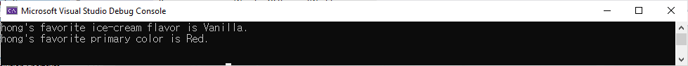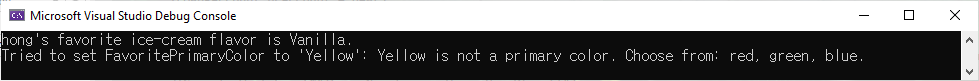 예제를 보면 ToString이라는 method를 호출하고 있는데 실제 Person class를 보면 아무것도 존재하지 않습니다. 그럼 어떻게 ToString method가 사용될 수 있을까? 이런 것이 가능한 이유는 잠시 후 알아보기로 하고 일단 project를 실행하여 아래와 같은 결과가 표시되는지를 확인합니다.