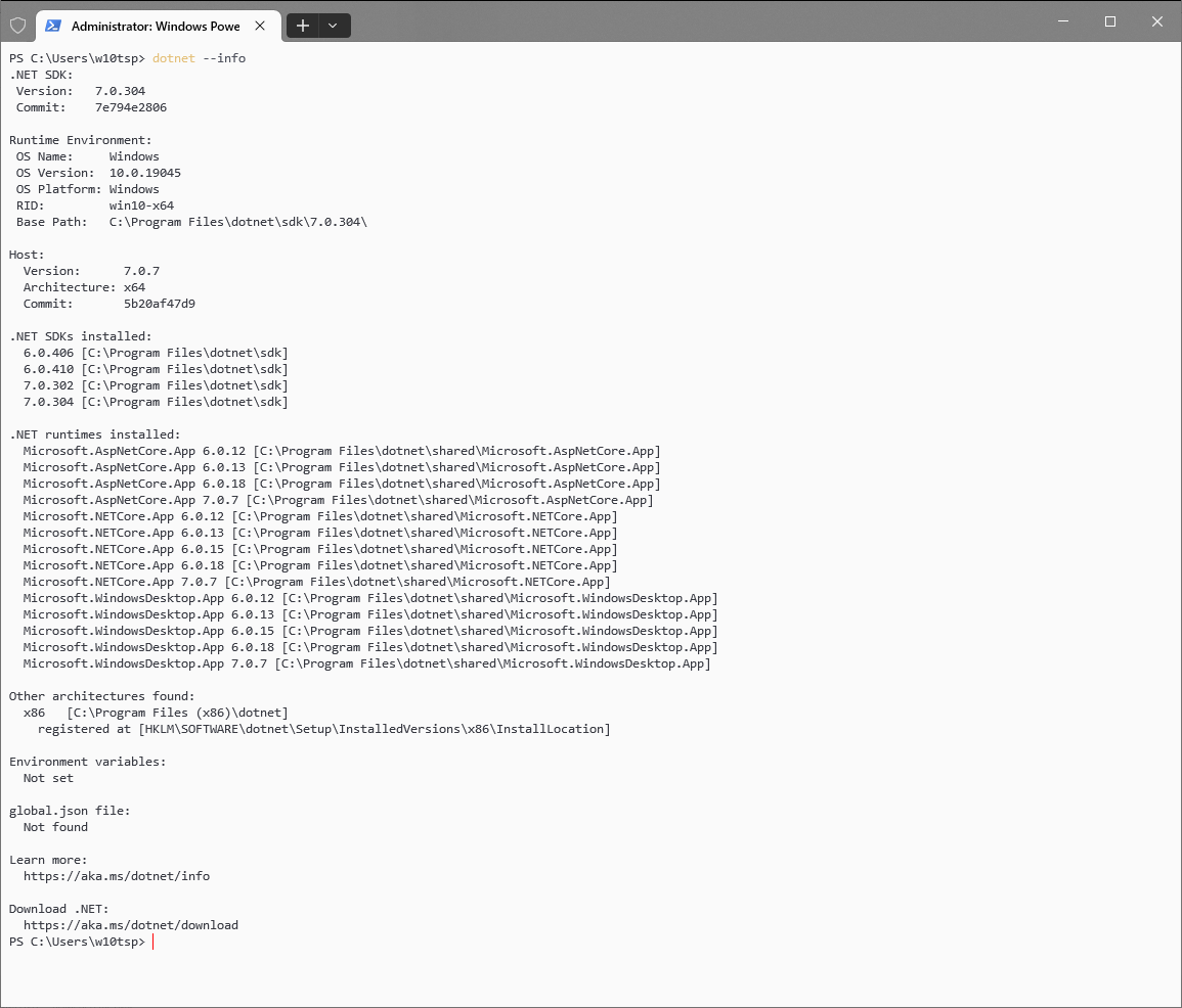 | .NET SDKs: Version Status ------------------------ 7.0.304 Up to date. Try out the newest .NET SDK features with .NET 8.0.100-preview.5.23303.2. .NET Runtimes: Name Version Status -------------------------------------------------------------------------- Microsoft.NETCore.App 5.0.17 .NET 5.0 is out of support. Microsoft.NETCore.App 6.0.7 Patch 6.0.18 is available. Microsoft.WindowsDesktop.App 6.0.7 Patch 6.0.18 is available. Microsoft.NETCore.App 6.0.10 Patch 6.0.18 is available. Microsoft.WindowsDesktop.App 6.0.10 Patch 6.0.18 is available. Microsoft.NETCore.App 6.0.11 Patch 6.0.18 is available. Microsoft.WindowsDesktop.App 6.0.11 Patch 6.0.18 is available. Microsoft.NETCore.App 6.0.12 Patch 6.0.18 is available. Microsoft.WindowsDesktop.App 6.0.12 Patch 6.0.18 is available. Microsoft.NETCore.App 6.0.13 Patch 6.0.18 is available. Microsoft.WindowsDesktop.App 6.0.13 Patch 6.0.18 is available. Microsoft.AspNetCore.App 6.0.14 Patch 6.0.18 is available. Microsoft.NETCore.App 6.0.15 Patch 6.0.18 is available. Microsoft.WindowsDesktop.App 6.0.15 Patch 6.0.18 is available. Microsoft.AspNetCore.App 6.0.18 Up to date. Microsoft.NETCore.App 6.0.18 Up to date. Microsoft.WindowsDesktop.App 6.0.18 Up to date. Microsoft.NETCore.App 7.0.3 Patch 7.0.7 is available. Microsoft.WindowsDesktop.App 7.0.3 Patch 7.0.7 is available. Microsoft.AspNetCore.App 7.0.7 Up to date. Microsoft.NETCore.App 7.0.7 Up to date. Microsoft.WindowsDesktop.App 7.0.7 Up to date. |