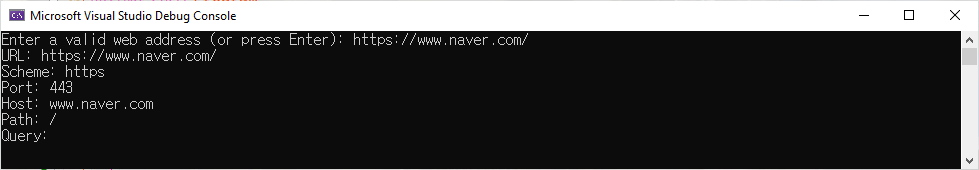 그리고 Program.cs에서 사용자에게 website주소의 입력을 요청하고 주소가 입력되면 Uri type을 사용해 해당 주소를 HTTP, FTP 등의 scheme, port 번호, host 등 각각의 요소로 분해하는 문을 아래와 같이 추가합니다.