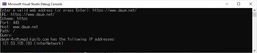 그리고 Program.cs에서 사용자에게 website주소의 입력을 요청하고 주소가 입력되면 Uri type을 사용해 해당 주소를 HTTP, FTP 등의 scheme, port 번호, host 등 각각의 요소로 분해하는 문을 아래와 같이 추가합니다.
