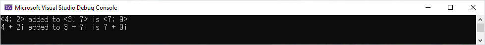 Console.WriteLine("{0} + {1}i added to {2} + {3}i is {4} + {5}i", c1.Real, c1.Imaginary, c2.Real, c2.Imaginary, c3.Real, c3.Imaginary);
