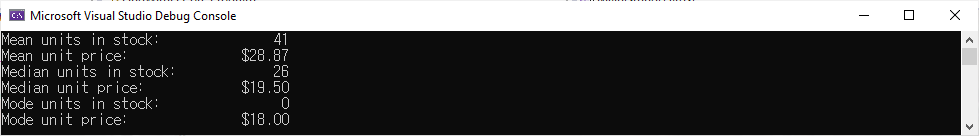 Console.WriteLine("{0,-25} {1,10:N0}", "Median units in stock:", db.Products.Median(p => p.UnitsInStock));