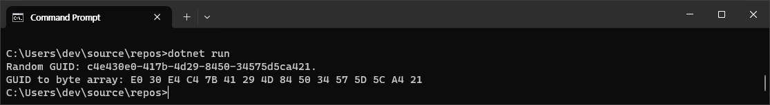 Console.Write("GUID to byte array: ");