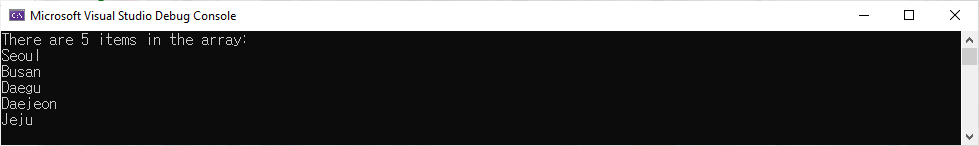 Program.cs에서 comma로 분리된 도시이름을 포함한 단일 문자열 변수를 정의하고 이를 Split method를 통해 분리하는 문을 추가합니다. 이때 분리의 기준을 comma로 지정하며 반환된 문자열값의 array를 열거하도록 합니다.