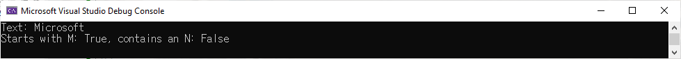 Console.WriteLine($"First char is {city[0]} and fourth is {city[3]}.");