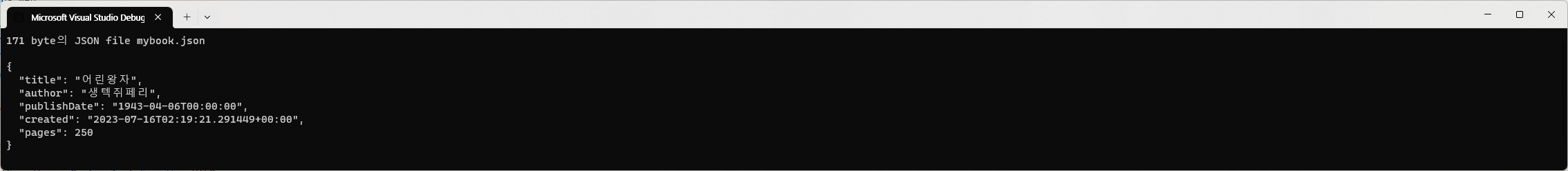 생성된 JSON file은 총 171byte로 member의 이름은 publishDate와 같이 camelCase가 적용되었습니다. 이는 Javascript를 사용하는 browser를 위한 가장 적합한 방식입니다. 또한 option설정에서 pages를 포함하여 모든 field를 포함하도록 했고 결과를 보면 사람이 읽기 쉽도록 하기 위해 JSON자체에 들여 쓰기 등의 서식이 적용되어 있음을 확인할 수 있습니다. DateTime와 DateTimeOffset값은 단일 표준 문자열 값으로 저장됩니다.