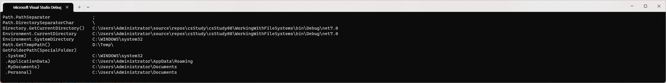 Console.WriteLine("{0,-33} {1}", arg0: "Directory.GetCurrentDirectory()", arg1: GetCurrentDirectory());
