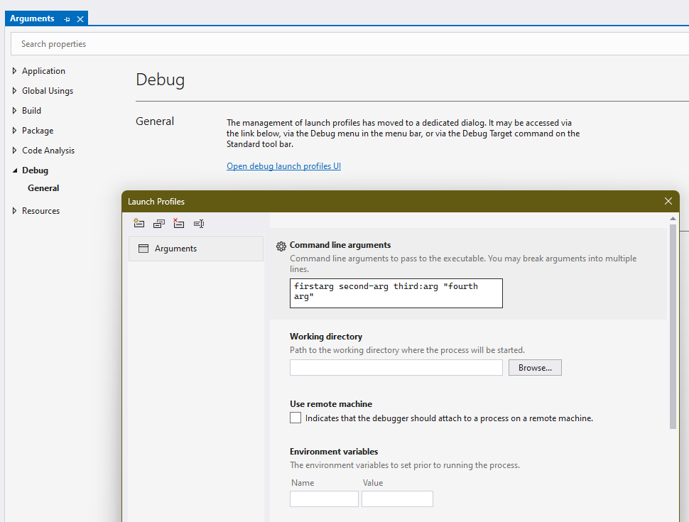 이제 Visual Studio의 Project의 속성으로 들어가 Debug tab을 선택하고 'Open debug launch profiles UI'를 click 합니다. 그리고 'Command line arguments'안에 인수값으로 'firstarg second-arg third:arg "fourth arg"'를 다음과 같이 입력합니다.