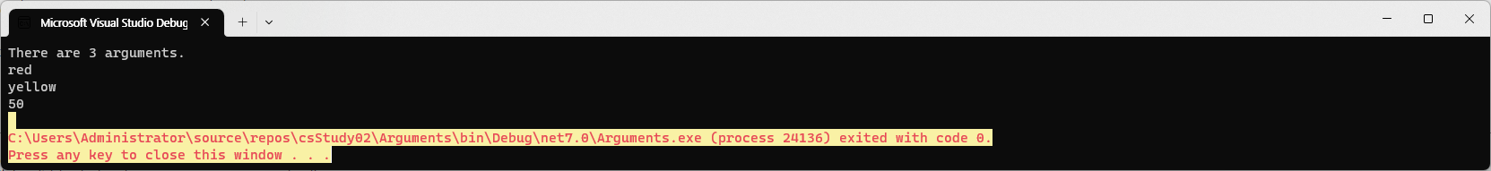 WriteLine("dotnet run red yellow 50");
