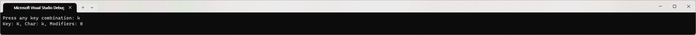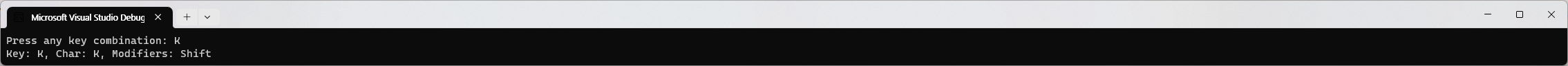 WriteLine("Key: {0}, Char: {1}, Modifiers: {2}", arg0: key.Key, arg1: key.KeyChar, arg2: key.Modifiers);