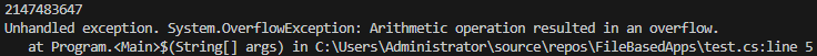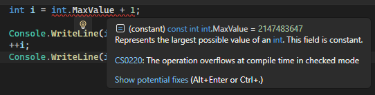 위에서 사용한 checked는 runtime에서 overflow가 발생한 경우 기본동작을 바꿔 예외를 발생시키도록 하기 위한 것입니다. 그런데 overflow는 compile단계에서 오류를 발생시키는 경우도 있습니다. 특히 VS2026과 같은 IDE에서 아래와 같이 overflow가 예상되는 구문을 작성했을때