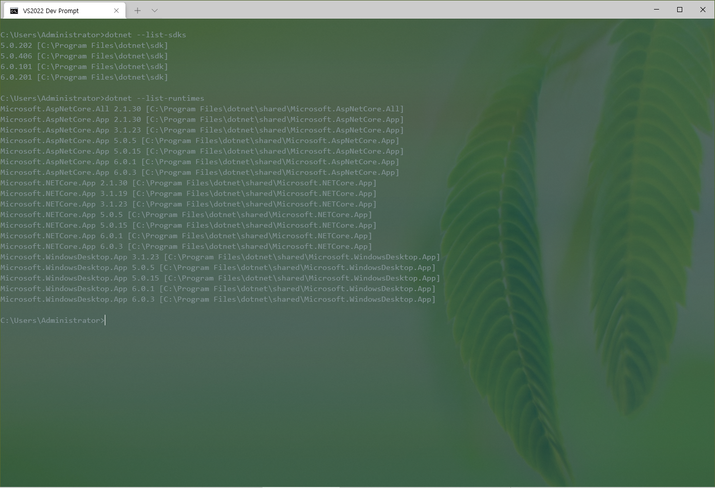 현재 시스템에 설치된 SDK와 Runtime은 아래 명령으로 확인할 수 있습니다.