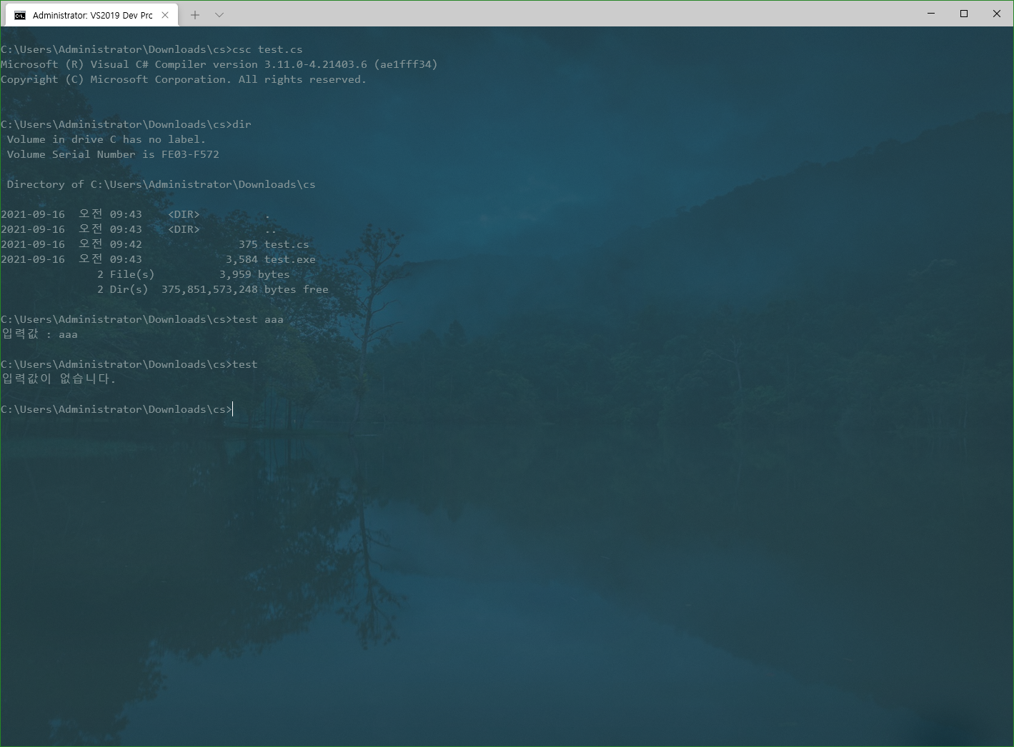 그러면 전용 명령창이 실행될텐데 거기에서 cd 명령으로 위의 파일을 생성한 폴더를 찾아가도록 합니다. 폴더를 찾아갔으면 'csc <파일명>'형식으로 파일을 컴파일합니다. 만약 Visaul Studio에서 코드를 입력한 경우라면 Ctrl + Shift + B 키를 눌러 프로젝트를 빌드하면 됩니다.