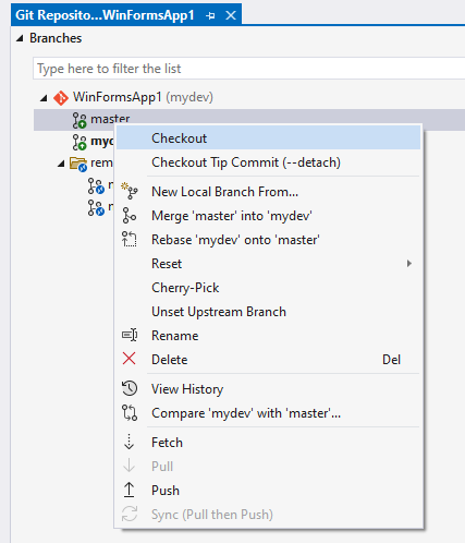예제는 master외에 mydev라는 새로운 Branch를 만들고