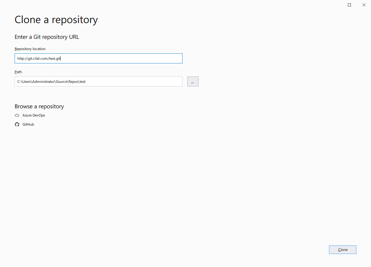만약 다른 사람이 Git Repository에서 소스코드를 내려 받으려면 Visual Studio의 File -> Clone Repository로 들어가 위에서 설정한 URL을 넣어주고 Clone버튼을 눌러줍니다.