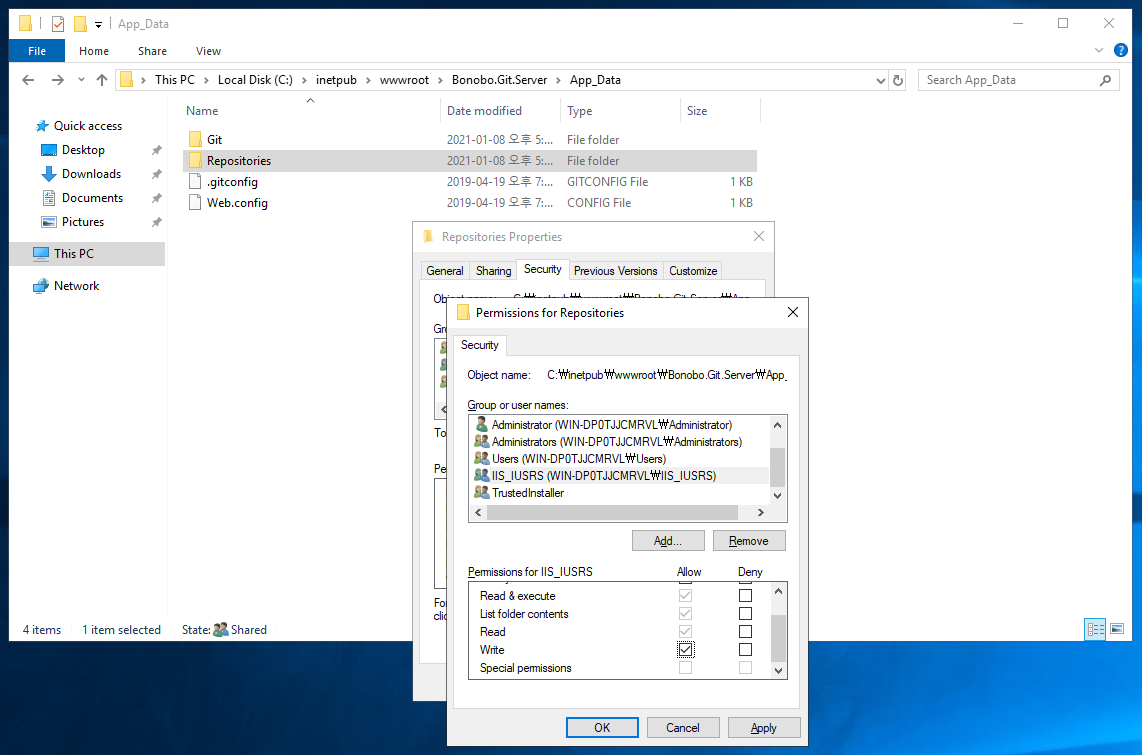 3) App_Data/Repositories 아래에 IIS_IUSRS계정으로 쓰기 및 읽기 설정을 부여합니다.