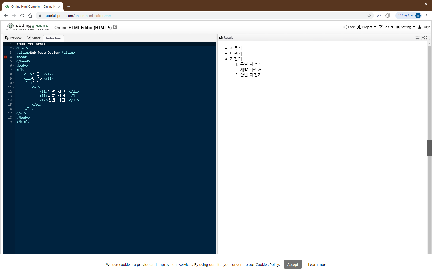 1과 2에서 <li>는 목록 자체를 지정하는 태그입니다. 이 태그 안에 목록 태그를 다시 집어넣어서 중첩된 목록을 만들 수 있습니다.