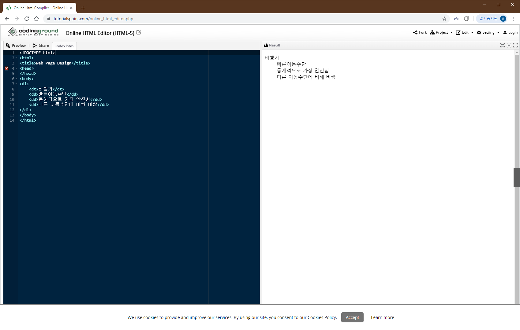 특정용어를 설명할 때의 목록 태그입니다. <dl> 태그로 시작해 <dt> 태그로 정의할 용어를 지정하고 <dd> 태그로 설명 목록을 만듭니다.
