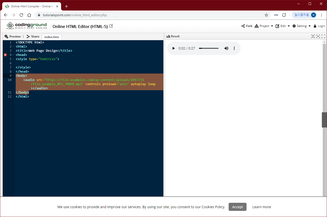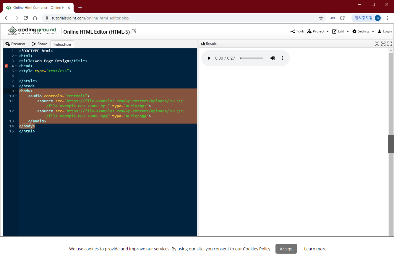 만약 각 브라우저마다 각각의 파일형식에 대응해야 한다면 audio태그를 다음과 같이 사용할 수 있습니다.