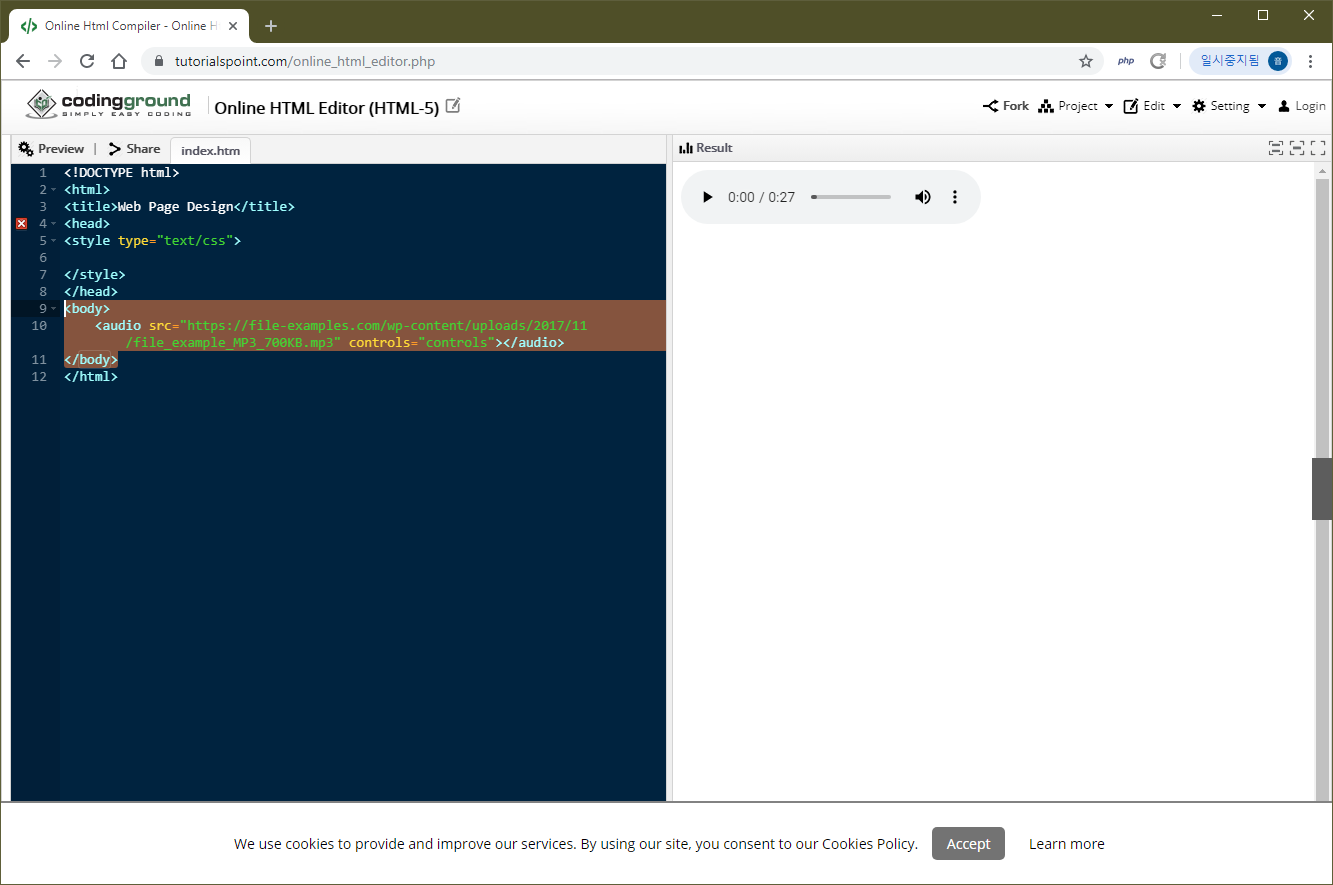 src속성에 사용하는 파일은 예제에서 mp3를 사용했으나 ogg나 wav같은 파일도 사용이 가능합니다. 다만 현재 이 글을 쓰는 시간 기준으로 크롬, 파이어폭스, 오페라만 이 세 가지 파일을 모두 지원하며 익스플로러는 mp3만, 사파리는 mp3와 ogg만 지원이 가능한 점 참고하시기 바랍니다.