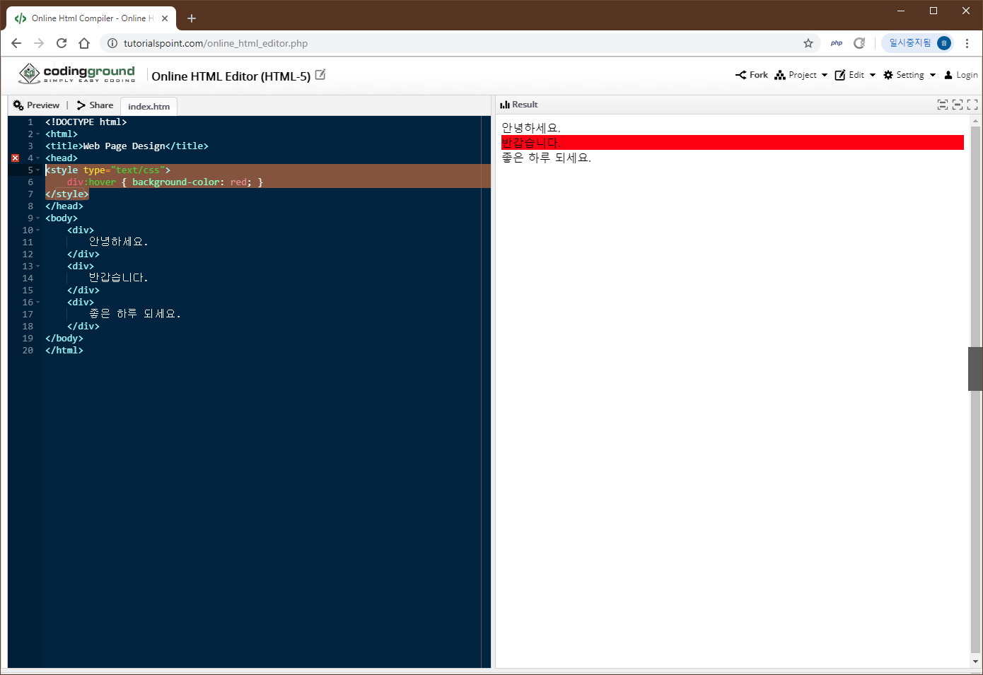 특정 요소에 대해 사용자의 동작에 따른 반응으로 요소를 선택합니다. 이때 active는 마우스 클릭 시, hover는 마우스를 요소위로 올릴 시 발생하게 됩니다. 따라서 아래 예제는 사용자가 마우스를 위로 위치하는 div의 배경색을 바꾸도록 합니다.