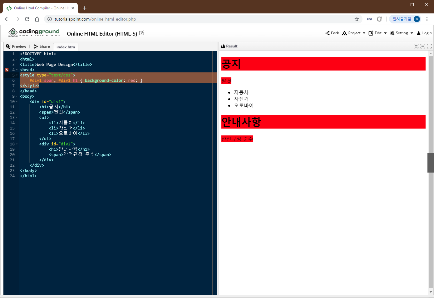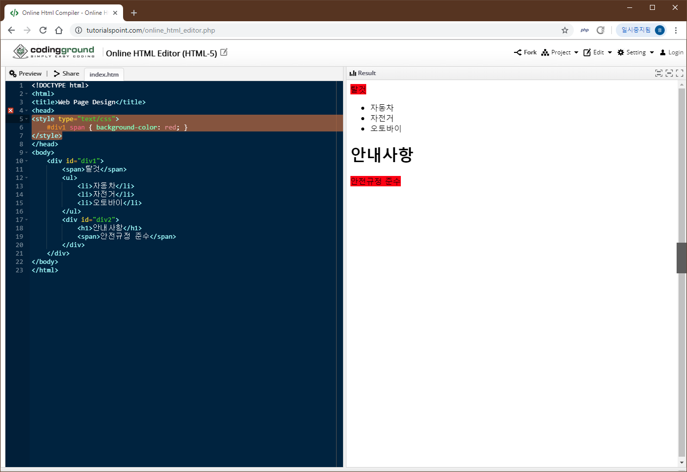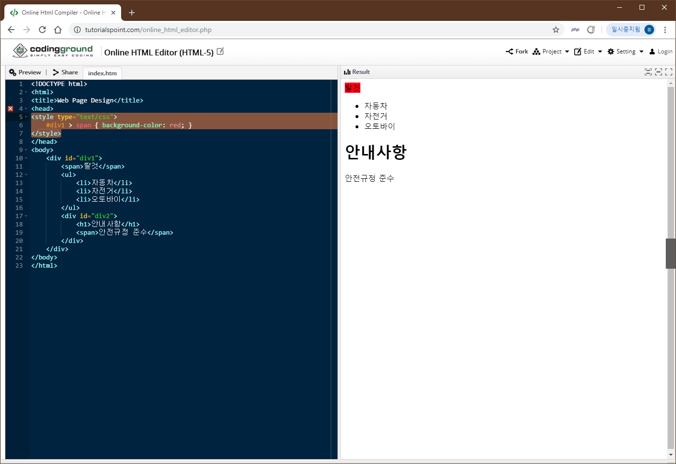 특정 요소의 자손을 선택하려면 > 기호를 사용합니다. 자손이라 함은 대상 요소에서 바로 아래 요소들만을 지정하며 아래 예시는 ID가 div1인 태그 바로 아래 위치하는 span자손만을 선택하도록 합니다.