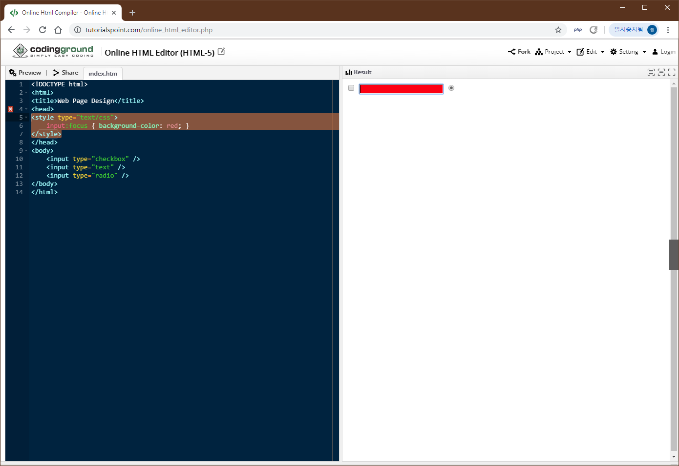 따라서 다음 예제는 input요소중에서 현재 커서(초점)가 맞춰져 있는 요소만 배경색을 변경하도록 합니다.